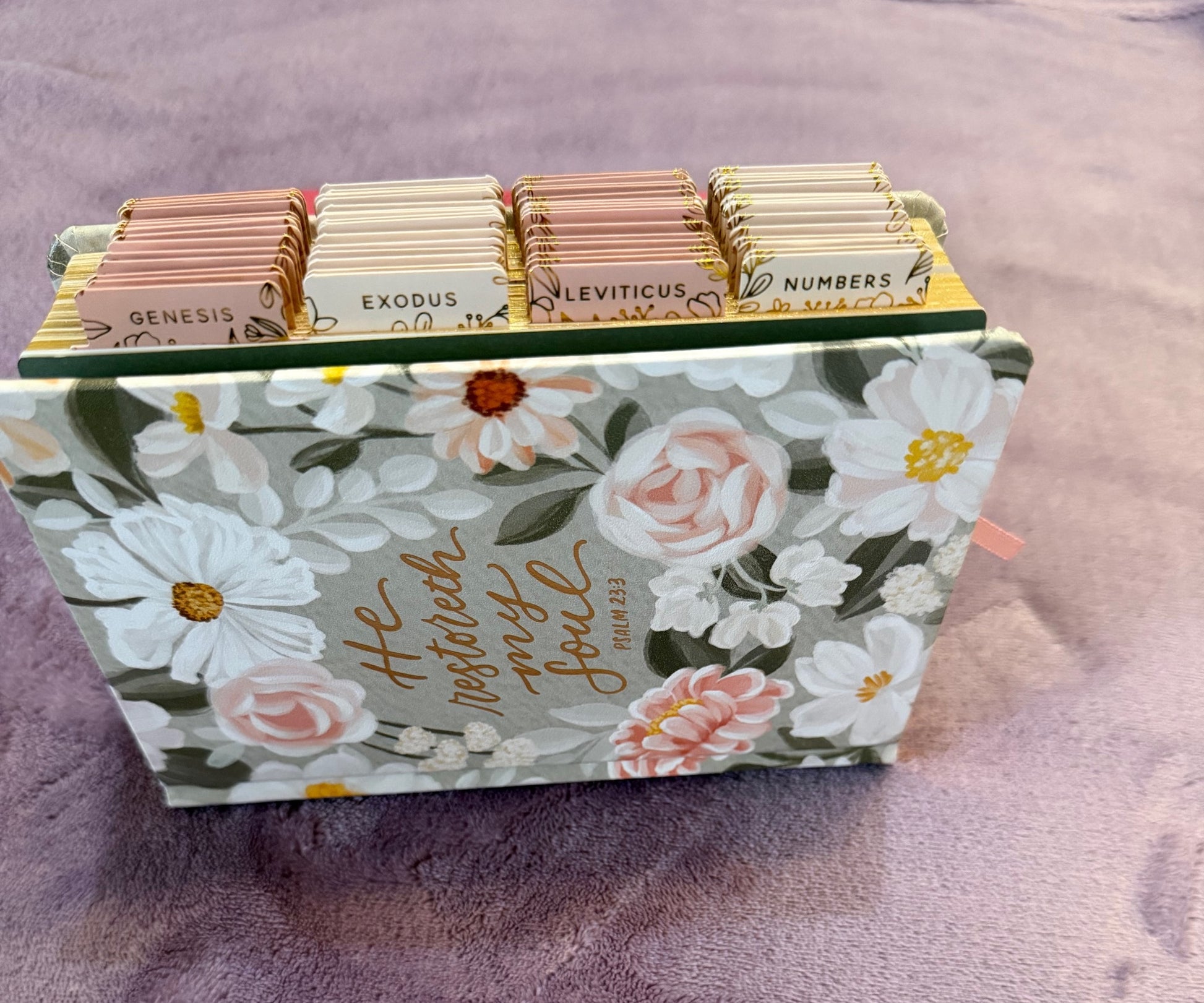 Beautifully coordinated pink and white leather Bible tabs with elegant gold foil print. Perfect for people on the go. Easy to carry and easy to use. Designed for portability. Fits easily in a purse or tote.
