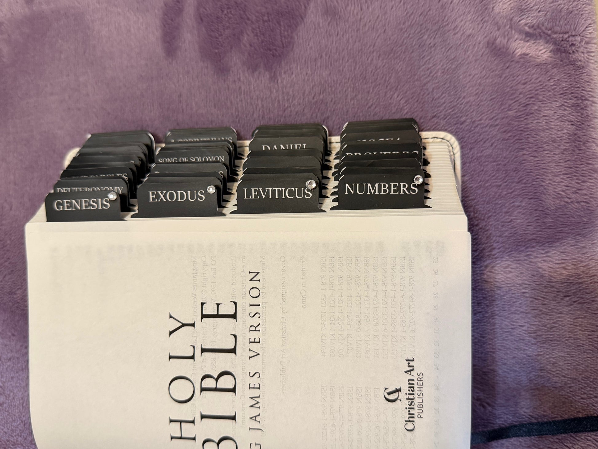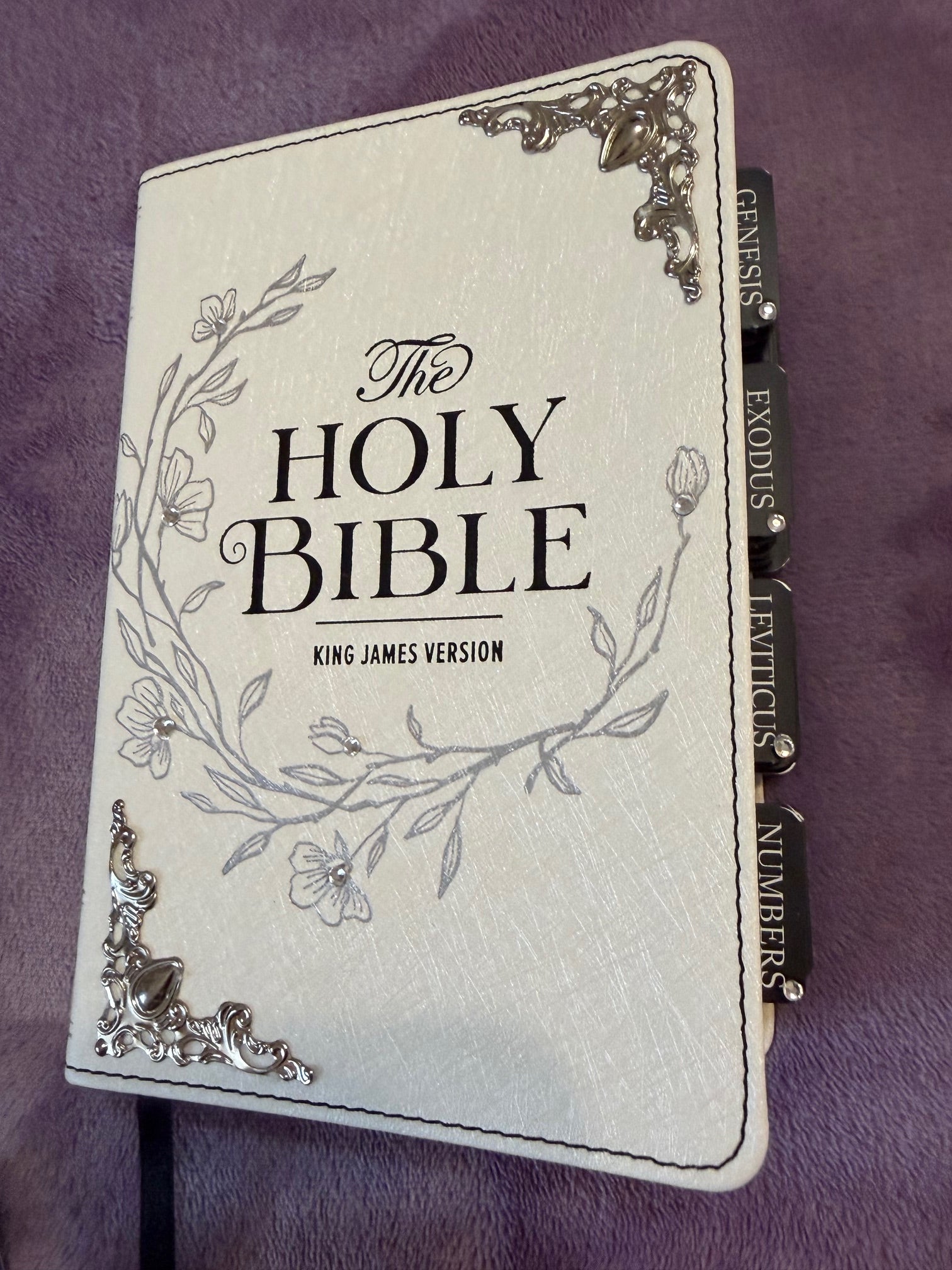 Vegan Leather Red Letter Edition, ribbon marker, with silver corners, diamonds on the cover, and beautiful black and white print Bible tabs adorned with jewels.