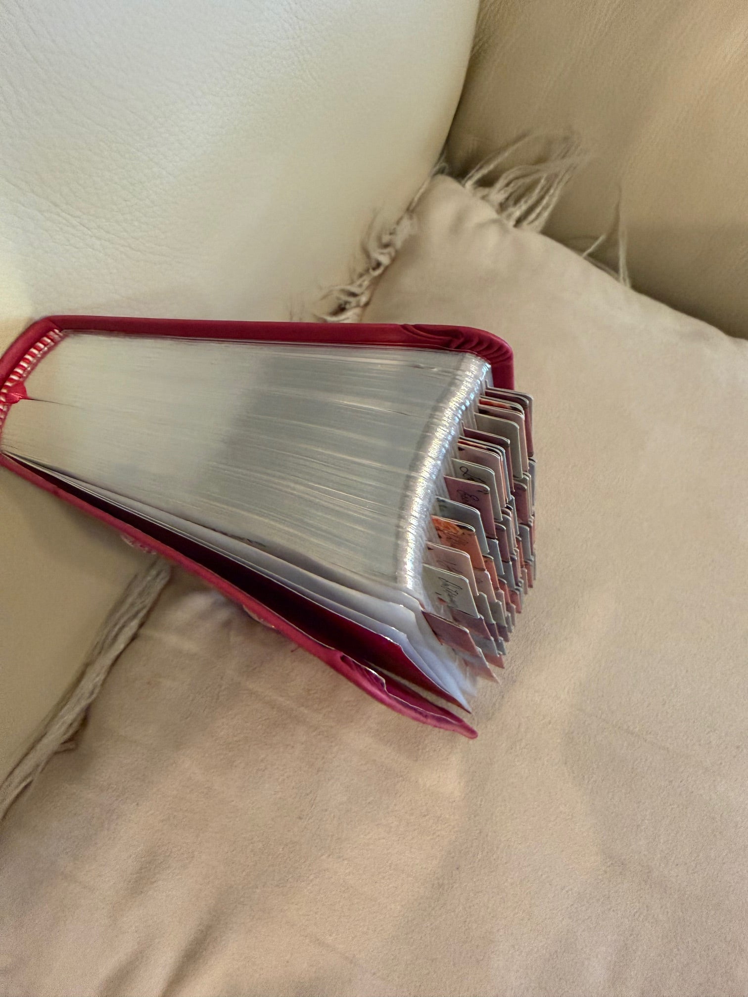 Pink LeatherTouch, with multicolored flowered Bible tabs and butterfly embellishments on the cover.